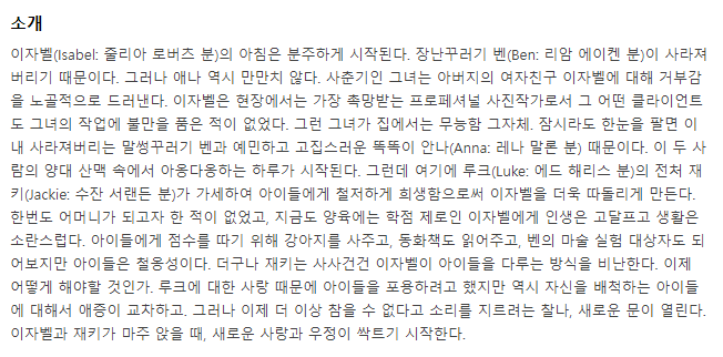 간단히 이야기를 하자면 이혼 가정에서 계모와 친모, 그리고 그들 사이에서 겪는 아이들의 혼란에 대한 문제를 다룬 영화라고 볼 수 있다. 요즘은 이혼이라는 소재가 그렇게 특별한 것은 아니다. 일상에서도 이를 겪는 가정을 만날 수 있고, 그들 사이에서 항상 아이가 없는 일은 나타나지 않는다. 그리고 이혼이라는 과정을 거치며 갈라서게 된 부부 당사자는 결국 원하는 길을 택할 뿐이며 이 과정에서 피해자는 아이들만이 남는다.